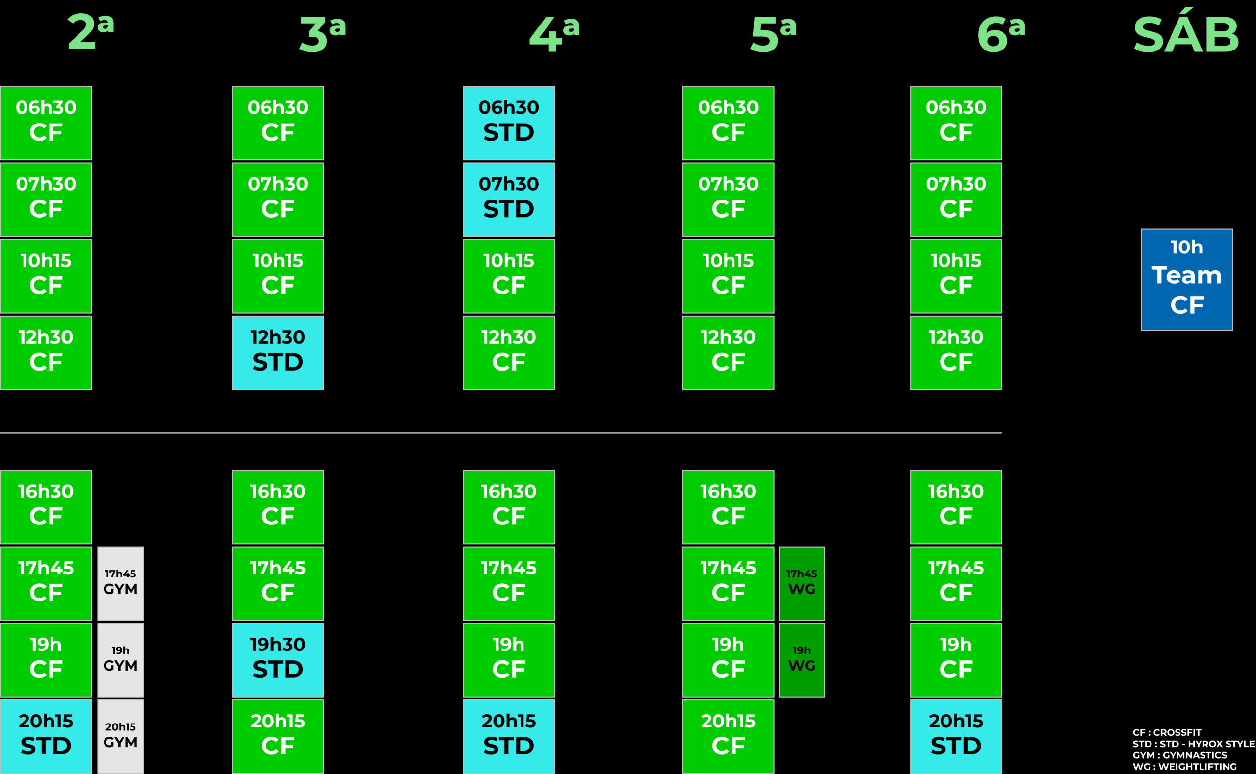 Aula de grupo conduzida por um coach, que se baseia na metodologia do CrossFit, esta é diferente de dia para dia, tal como, de semana para semana.